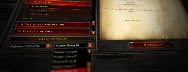 To jeszcze nie koniec z ustawieniami. Teraz, dzięki włączeniu opcji opisanej w poprzednim akapicie, w dolnej części okna wyboru zadania, obok rozwijanego menu poziomu trudności, pojawi się drugie - odpowiedzialne za ustawienia Siły Potworów. Dzięki niemu możemy zdecydować się na brak siły potworów, co jest domyślnym ustawieniem dla każdego poziomu trudności gry, bądź wybrać wartość z zakresu od 1 do 10. Poziom ten można ustalić oddzielnie dla każdej postaci i poziomu trudności, oraz można go zmienić w dowolnej chwili w tym samym miejscu. Jeśli nadal nie wiesz gdzie są opisane w tym paragrafie opcje, z pewnością pomocne okażą się dwa poniższe screeny, które możesz powiększyć w calu zobaczenia miejsca ulokowania opcji na ekranie gry.