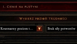 To jeszcze nie koniec z ustawieniami. Teraz, dzięki włączeniu opcji opisanej w poprzednim akapicie, w dolnej części okna wyboru zadania, obok rozwijanego menu poziomu trudności, pojawi się drugie - odpowiedzialne za ustawienia Siły Potworów. Dzięki niemu możemy zdecydować się na brak siły potworów, co jest domyślnym ustawieniem dla każdego poziomu trudności gry, bądź wybrać wartość z zakresu od 1 do 10. Poziom ten można ustalić oddzielnie dla każdej postaci i poziomu trudności, oraz można go zmienić w dowolnej chwili w tym samym miejscu. Jeśli nadal nie wiesz gdzie są opisane w tym paragrafie opcje, z pewnością pomocne okażą się dwa poniższe screeny, które możesz powiększyć w calu zobaczenia miejsca ulokowania opcji na ekranie gry.