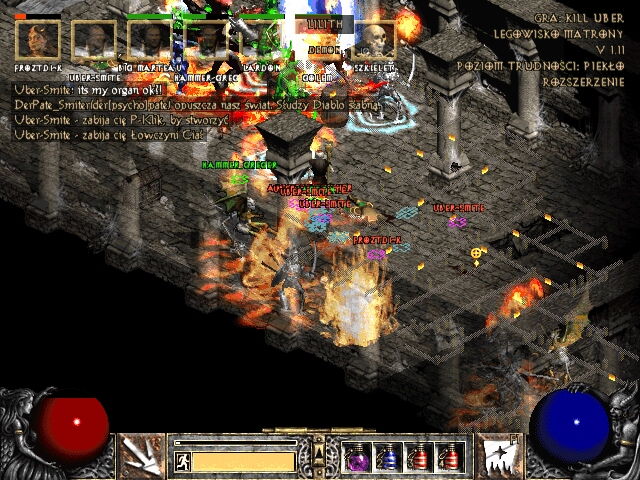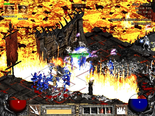 Prawie go ubiliśmy, ale zaczął się regenerowac i ziom poszedł po pomoc. Wrócił z palem hamerem. Ubił z nami duriela i zdobyliśmy oko. Następnie jakies dwa tygodnie póĄniej miałem klucz nienawiści i znalazłem gre "Kill Uber" no to wszedłem i patrze portal do Lilith. Pomyslałem : "mamy oko pora na róg" i tak się pięknie złożyło, że wokół Lilith było pełno itemków i gdy ją zabili nikt nie wiedział gdzie jest róg. Pokusiłem sie i nieprzypadkowo znalazł sie w moim ekwipunku ;P. Z kolei na następny dzień za ista, którego wcześniej znalazłem, kupiłem keyset i modliłem sie o piec bólu. Piec sie otworzył, ale mój kolega dostał rd i musiałem na niego dłuuugo czekać. Gdy wrócił już doświadczeni sami i utłukliśmy Izualka. Mając wszystkie klucze nie mogliśmy się oprzeć, żeby otworzyc trist. Po otworzeniu pomyślałem co tam może takiego być??? ale gdy wszedłem omal nie dostałem zawału. Od razu Mef na mnie naskoczył zdechłem kilka razy i na zmiane z kumplem wołaliśmy o delikatną pomoc. Weszło dwóch pali, jeden przyjaĄnie nastawiony i drugi taki dziwny. Z trudem ale zatłukliśmy wszystko i wypadł torch i sztandary. Wtedy ten dziwny pal wyszedł z gry a ja się pytam gdzie torch???
