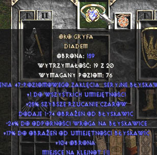 Dzięki bonusowi do umiejętności zwiększa obrażenia, bonus do many bardzo pomaga podczas baalrunów, ponieważ każde rzucenie furii błyskawic na 37+ poziomie pożera prawie 30 many.