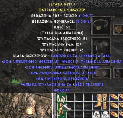 interesującymi dodatkami, np. Oszczepy +2 do poziomu Amazonki, +2 do um. oszczepu i włóczni, 40% szybszy atak.