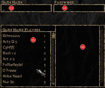 Przyłączanie się do istniejącej już gry jest jeszcze prostsze. Jeżeli znamy jej nazwę wystarczy ją wpisać w okienku (13). Tak samo hasło (14). W oknie poniżej (15) wyświetlają się dostępne aktualnie gry (oczywiście tylko te, do których możemy wejść, tzn. bez hasła i dla których spełniamy wymogi levelowe). Dodatkowo widzimy tylko nazwy gier z naszego poziomu trudności - żeby wejść do gier z niższych poziomów musimy znać ich nazwy. Po kliknięciu na którąś z nazw w ramce obok (16) pokazują się dodatkowe informacje takie jak czas trwania gry, liczba graczy, opis itd.
