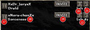 Na liście graczy możemy wyczytać nazwy i klasy ich postaci (18). Osoby dla nas neutralne możemy zaprosić do drużyny (19). Za pomocą przycisków (20) i (21) możemy sprawić, że dany gracz nie będzie nas słyszał, lub żebyśmy my nie słyszeli wybranego gracza. Jest to przydatne przy rozgrywkach drużynowych, gdy nie chcemy aby konkurencyjna drużyna poznała nasze plany. Ważną informacją w oknie drużyny jest poziom postaci (22).