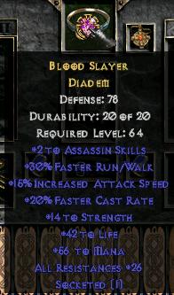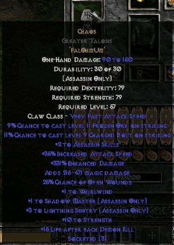 Piękne staty, 2assa/20fcr/life/mana/res coś pięknego, oczywiście są też takie z str i dex, ale kosztują po 5k fg+ Jak ktoś ma jsp to wie co to znaczy :)