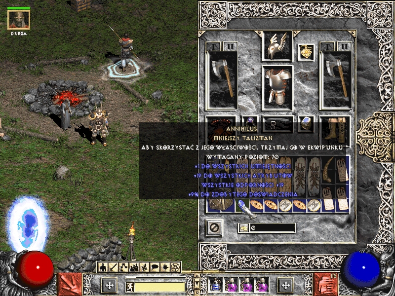 Ja się patrzę, a ten sobie stoi w najlepsze między kamykami i zaczyna rzucać czary. Szybko do niego podbiegłem i zacząłem atakować zapałem mając włączoną świętą tarcze i fanatyzm. Szło nawet nieĄle, ale na 68 poziomie nie mogłem się spodziewać żadnych rewelacji. Zużywszy cały pasek poległem i postanowiłem zaryzykować powrót do gry postacią z innego konta. Zdążyłem jednak powrócić moim barbem uzbrojonym w full IK na 84 lvl. Jako, że miałem ponad 3300 HP i obrażenia od koncentracji ok 6,5K (nic wielkiego...), a DC miał już mniej niż połowę żyć, to killnąłem skubańca i zdobyłem anniego.