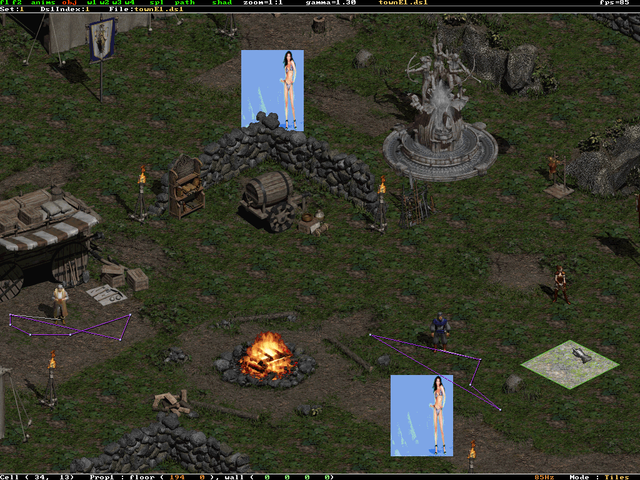 Następnie klikamy w: _Multiple ds1 demo.bat. Po chwili jesteśmy już w programie i widzimy pierwsze miasto: (townE1.ds1), przyciskami: 1 do: 0 przełączamy się pomiędzy naszymi mapami, w naszym przypadku: 1 włącza townE1.ds1, a 2TownWest.ds1.