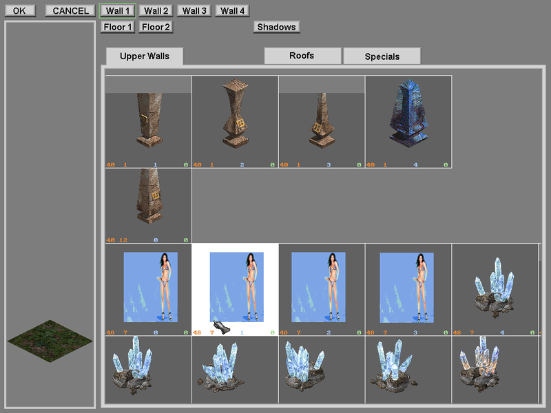 1. Gdy chcemy zmienić planszę klikamy na dowolnym elemencie planszy prawym przyciskiem myszy: (ppm), następnie przycisk: Floor1, wybieramy interesujące nas tło: ”podłogi” (a raczej kawałek tła, z paru kawałków zrobimy całość) i klikamy: lpm (lewym), po zrobieniu ”podłogi” możemy zacząć robić mury. Klikamy na: Wall1 i wybieramy murek. Floor1 od: Floor2 różni się pierwszeństwem wyświetlania (czyli co jest widoczne na ekranie w pierwszej kolejności), tak samo: Wall1, Wall2, Wall3, Wall4, w pierwszej kolejności wyświetlają się (nakładają się, są na górze) Wall4 następnie: Wall3, Wall2, Wall1, Floor2 i na końcu: Floor1, czyli po wybraniu czegoś z: Floor1 i nałożeniu (klikamy w to samo miejsce: ppm) Wall1, wyświetli nam się np.: mur z Wall1 a pod nim będzie: ”podłoga” z Floor1.