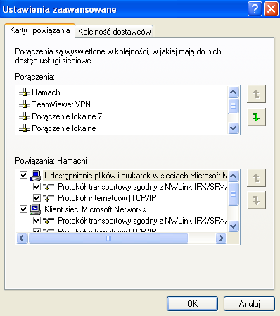2. Start --> Ustawienia --> Panel sterowania --> Połączenia sieciowe --> Zaawansowane --> Ustawienia zaawansowane... --> Karty i powiązania --> zaznaczyć "Hamachi" i przenieśc zieloną strzałką na samą górę --> kliknąć Ok