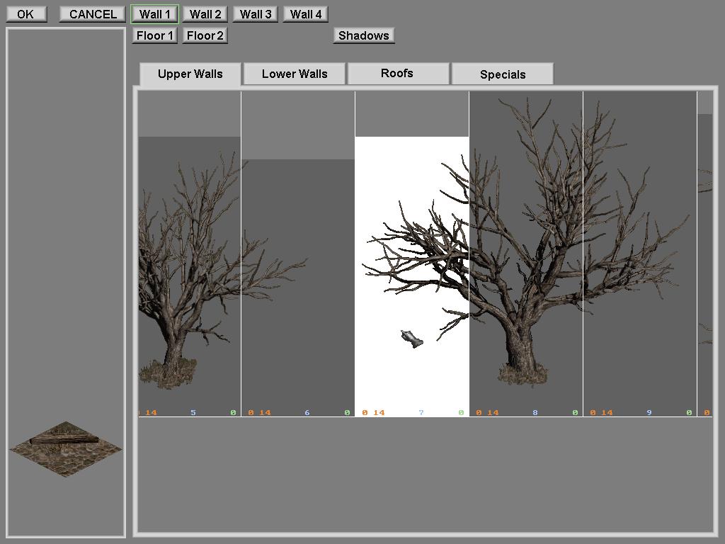 1.Gdy chcemy zmienić planszę klikamy na dowolnym elemencie planszy prawym przyciskiem myszy (ppm), nastepnie przycisk Floor1, wybieramy interesujące nas tło ”podłogi” (a raczej kawałek tła, z paru kawałków zrobimy całość) i klikamy lpm (lewym), po zrobieniu ”podłogi” możemy zacząć robić mury…Klikamy na Wall1 i wybieramy murek. Floor1 od Floor2 różni się pierwszeństwem wyświetlania (czyli co jest widoczne na ekranie w pierwszej kolejności), tak samo Wall1, Wall2, Wall3, Wall4, w pierwszej kolejności wyświetlają się (nakładają, są na górze) Wall4 następnie Wall3, Wall2, Wall1, Floor2 i na końcu Floor1, czyli po wybraniu czegoś z Floor1 i nałożeniu (klikamy w to samo miejsce ppm) Wall1 wyświetli nam się np.mur z Wall1 a pod nim będzie ”podłoga” z Floor1.