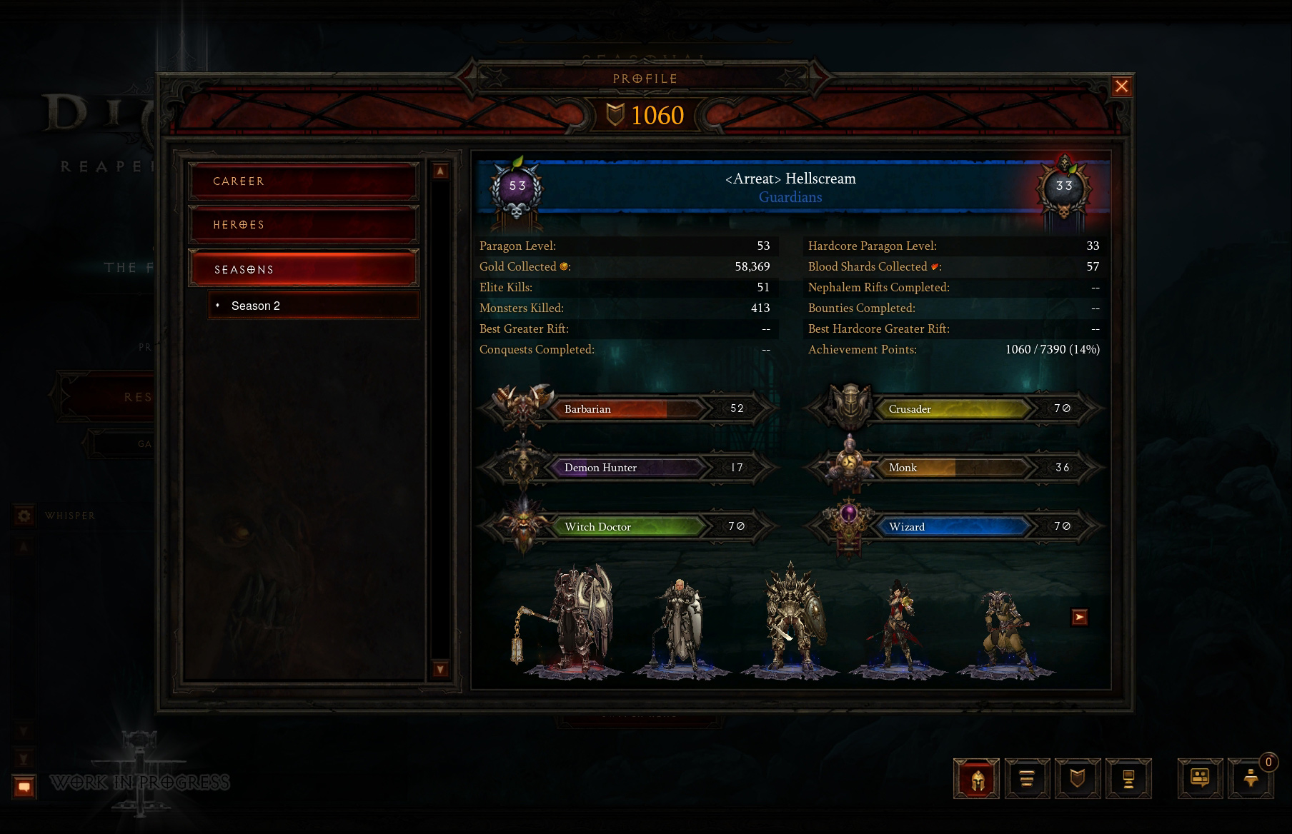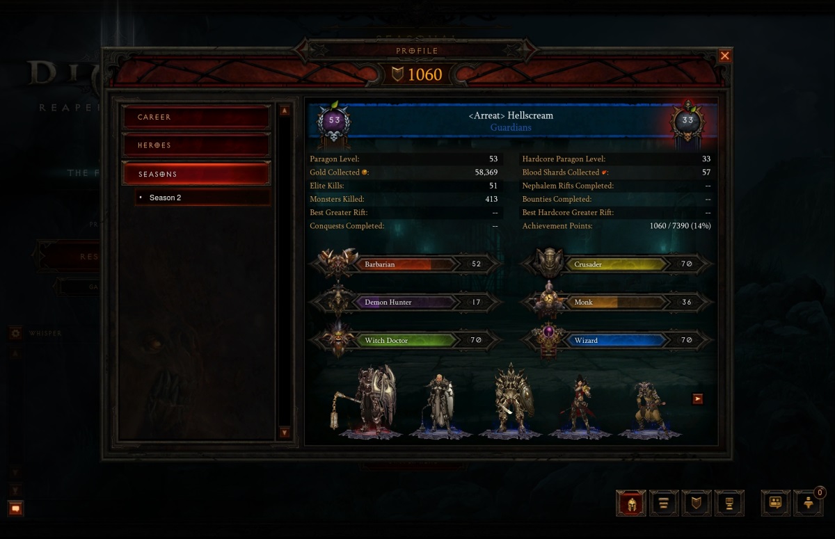 Tak jak rankingi w Diablo II, tryb sezonowy pozwoli graczom na okresowe rozpoczynanie rozgrywki zupełnie od nowa i rozwijanie swoich bohaterów i rzemieślników od poziomu 1 całkowicie od zera. Wzięcie udziału w trybie sezonowym przyniesie wiele korzyści, w tym nagrody specjalne i wyjątkowe przedmioty legendarne, a także dreszczyk emocji, gdy będziecie piąć się w górę rankingu i współzawodniczyć z innymi w Podbojach, zdobywaniu osiągnięć i przemierzaniu Głębokich Szczelin.
