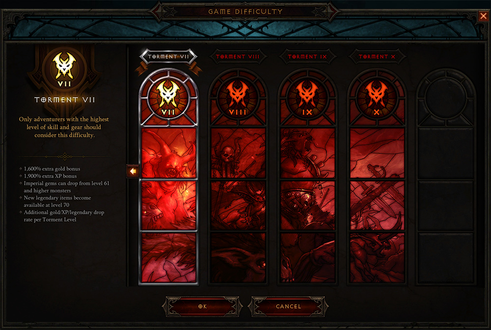 Gracze wciąż odkrywają nowe, potężne elementy ekwipunku, w związku z czym najbardziej wymagający obecnie poziom trudności – Udręka VI – może się wydać zbyt łatwy. Aby upewnić się, że najmężniejsi weterani nie wyjdą z wprawy w trzebieniu legionów Piekieł, oddajemy w wasze ręce cztery nowe poziomy z odpowiednim łupem i nagrodami, aż do Udręki X! Będziemy dopracowywać te poziomy trudności (oraz nagrody) podczas testów na PST, dlatego czekamy na wasze opinie i sugestie!
