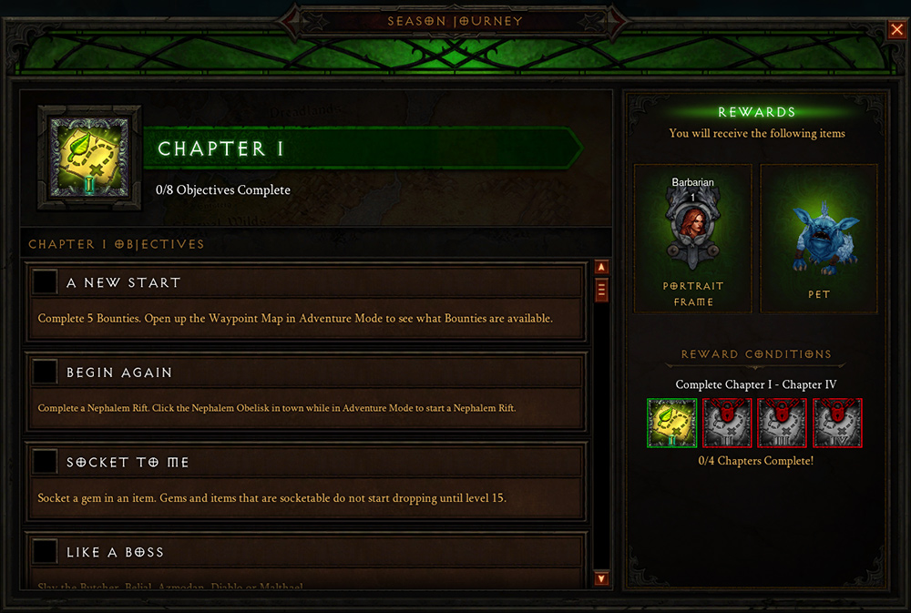 Postępy każdego gracza biorącego udział w rozgrywkach sezonowych wyglądają nieco inaczej. Podobnie sprawa ma się z ich osiągnięciami. Począwszy od sezonu 4 będziecie mogli śledzić swoje indywidualne postępy poczynione w danym sezonie dzięki nowemu, specjalnemu elementowi interfejsu. Ta pomocna funkcja podzielona jest na rozdziały, zawierające kamienie milowe, które może osiągnąć większość graczy, oraz rangi – dostępne dla graczy zaawansowanych. Osiąganie rang odblokowuje dodatkowe ramki portretów, zaś najwyższa ranga niesie ze sobą wyzwania, którym sprostanie będzie wymagało wysiłku i umiejętności od nawet najpotężniejszych spośród nefalemów!