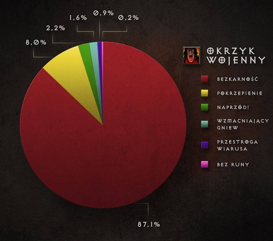 Obecnie pancerz energii jest używany przez 83% czarowników na poziomie 60. Z kolei wykorzystanie okrzyku wojennego u barbarzyńców na 60 poziomie przedstawia się następująco:
