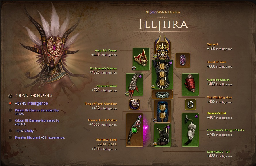 Sprzęt zwiększający obrażenia od trucizny znacznie przyśpieszy chwilę, kiedy poczujecie pełną moc tej konfiguracji. Szukajcie takich przedmiotów jak Bagienne Spodnie czy Kamień Jordana. Tak jak w przypadku pozostałych konfiguracji wykorzystujących przywołańców, obrażenia od trafień krytycznych zawsze mają wysoki priorytet ze względu na wysoką efektywność końcową. Szybkość ataku też jest mile widziana. Wiecie dlaczego? WINCYJ ZATRUTYCH STRZAŁEK!