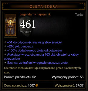 Dobrym przykładem jest Złota Skóra. 100% premii do znajdowania złota plus szansa, że potwory upuszczą złoto, gdy zostaną trafione. Całkiem nieźle, prawda? Minusem jest to, że gdy ustalane są statystyki przedmiotu, nie mogą zostać wylosowane dla niego podstawowe statystyki postaci. Zamiast tego skupiliśmy się na oddaniu klimatu przedmiotu, który jest przecież skórą ze złota (!) i w związku z tym będzie dawał swojemu użytkownikowi dodatkowe odporności i redukcję przyjmowanych obrażeń. W ten sposób przedmiot oferuje graczowi kilka interesujących możliwości wykorzystania go do wzbogacenia własnego stylu gry. Jeśli naprawdę chce się zdobywać góry złota dzięki temu przedmiotowi trzeba znaleźć inne źródła potrzebnych statystyk. Balansowanie swojego zestawu wyposażenia z użyciem takich przedmiotów może wiązać się z ciekawami wyzwaniami.